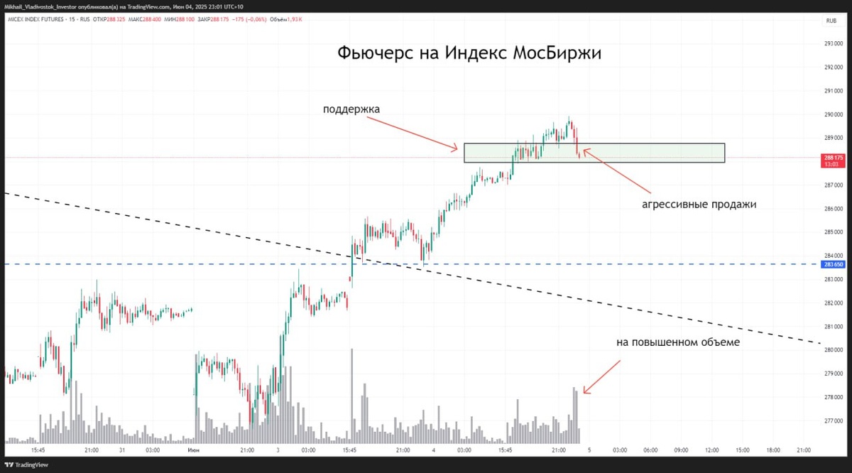 Довольно сильные продажи пошли по фьючерсу на Индекс МосБиржи