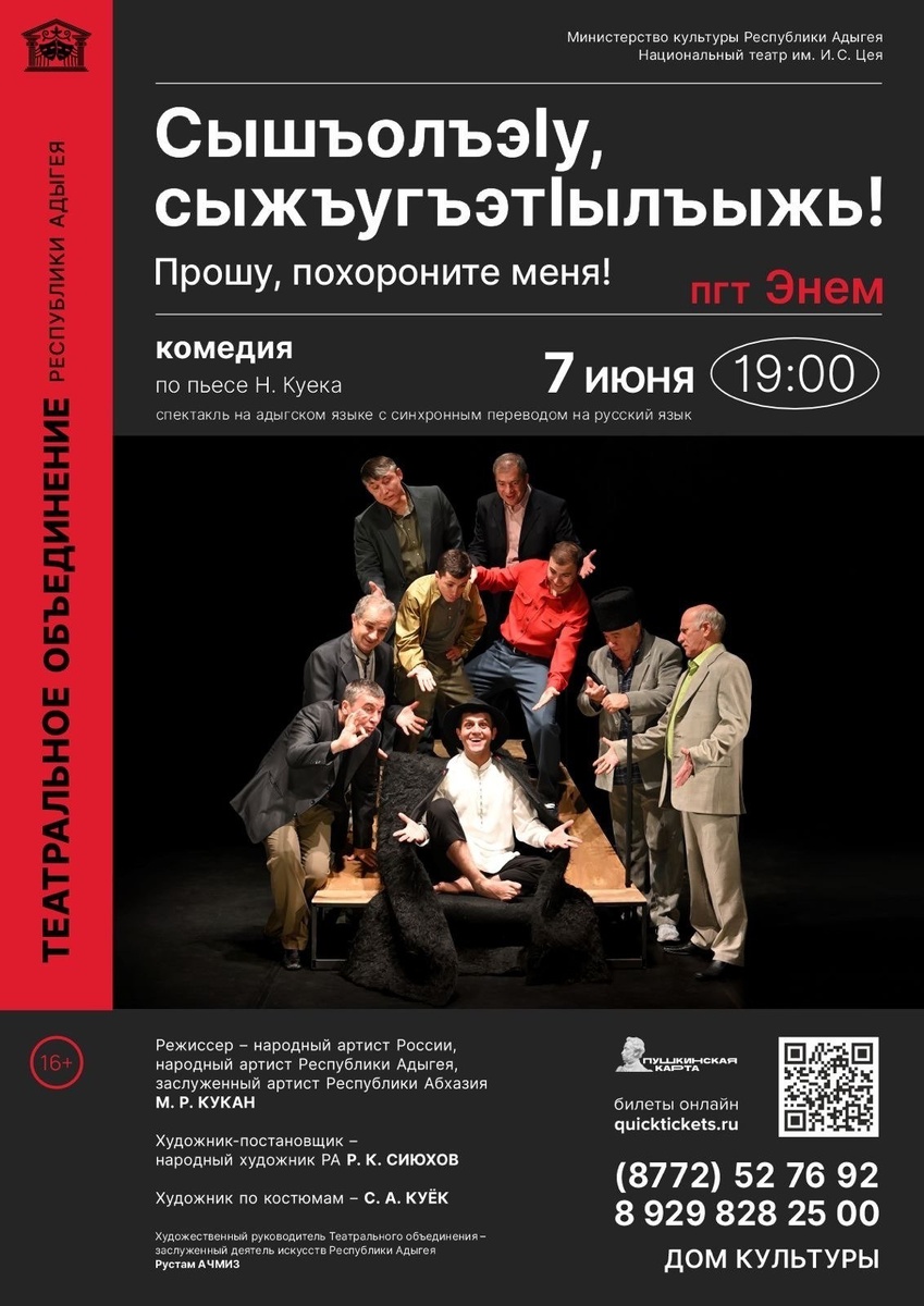 7 июня в 19:00 в ДК пгт. Энем пройдет комедия по пьесе Н.Куёк «Сышъолъэlу, сыжъугъэтlылъыжь!» («Прошу, похороните меня») в постановке народного артиста РФ Мурата Кукана 🎭