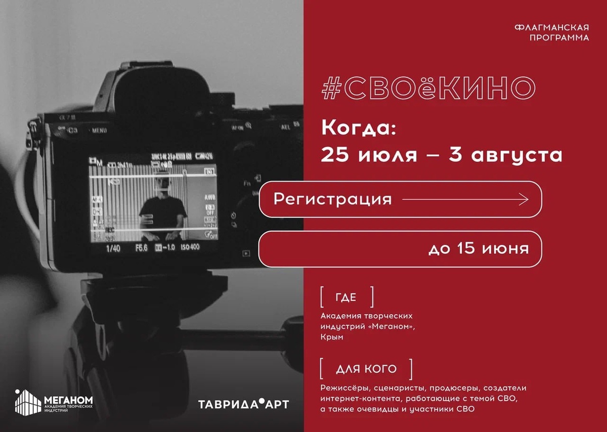 Программа #СВОёКИНО приглашает молодых кинематографистов! Академия «Меганом» приглашает молодых режиссеров, сценаристов, продюсеров, представителей региональных творческих объединений и киносообществ, а также очевидцев и участников специальной военной операции принять участие в программе #СВОёКИНО! 📅 Даты проведения: c 25 июля по 3 августа 2025 года 🏝 Место проведения: Академия «Меганом», город Судак, Республика Крым 🎬 Цель программы: Создание актуальных творческих проектов, отражающих события специальной военной операции. Работа над идеями игровых, документальных и интернет-проектов на основе реальных свидетельств и личного опыта участников. ✨ Что получат участники: — Возможность создать уникальные кинопроекты на основе живых историй и эмоций. — Интерактивный образовательный интенсив от профессионалов киноиндустрии. — Обучение особенностям профессии в кино и основам кинопроизводства. 💼 Кого приглашаем: Молодых специалистов киноиндустрии, членов творческих сообществ и всех за