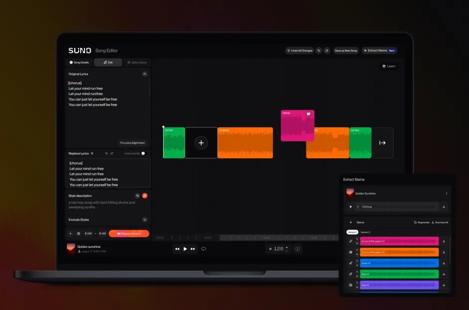 В сервис для генерации песен Suno добавили редактор музыки. Пользователь может перемещать фрагменты или исправлять неудачные отрывки.