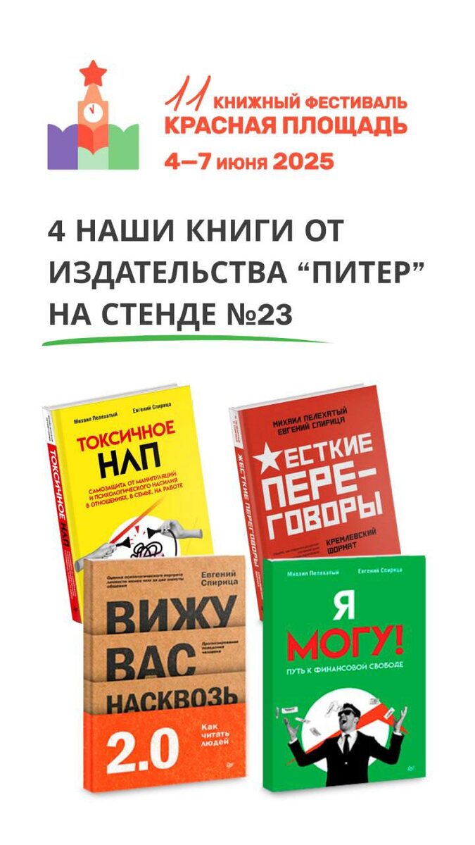 Мы на книжном фестивале «Красная площадь». Друзья, кто в Москве, заходите 📚📚 С 4 по 7 июня на главной площади столицы состоится грандиозное литературное мероприятие. На стенде №23 в зоне «Нон-фикшн» издательство «Питер» представит бестселлеры и новинки. Среди них и наши книги. Несмотря на то, что стенд издательства очень небольшой, взяли целых 4 книги: ▪️ NEW Вижу вас насквозь 2.0 ▪️ Токсичное НЛП ▪️ NEW Я могу! Путь к финансовой свободе ▪️ Жесткие переговоры На скринах👆 новые отзывы о нововышедшей книжечке. Спасибо, что пишете! Кото-то спрашивал, будет ли в Буквоеде, - уже, ловите. На видео - книга в «Буквоеде» в СПБ. Со всеми нашими книгами можно познакомиться здесь: ссылка #книжныйфестиваль #краснаяплощадь #издательствопитер #книжныеновинки #книги #вижуваснасквозь #токсичноенлп #ямогу #жескиепереговоры