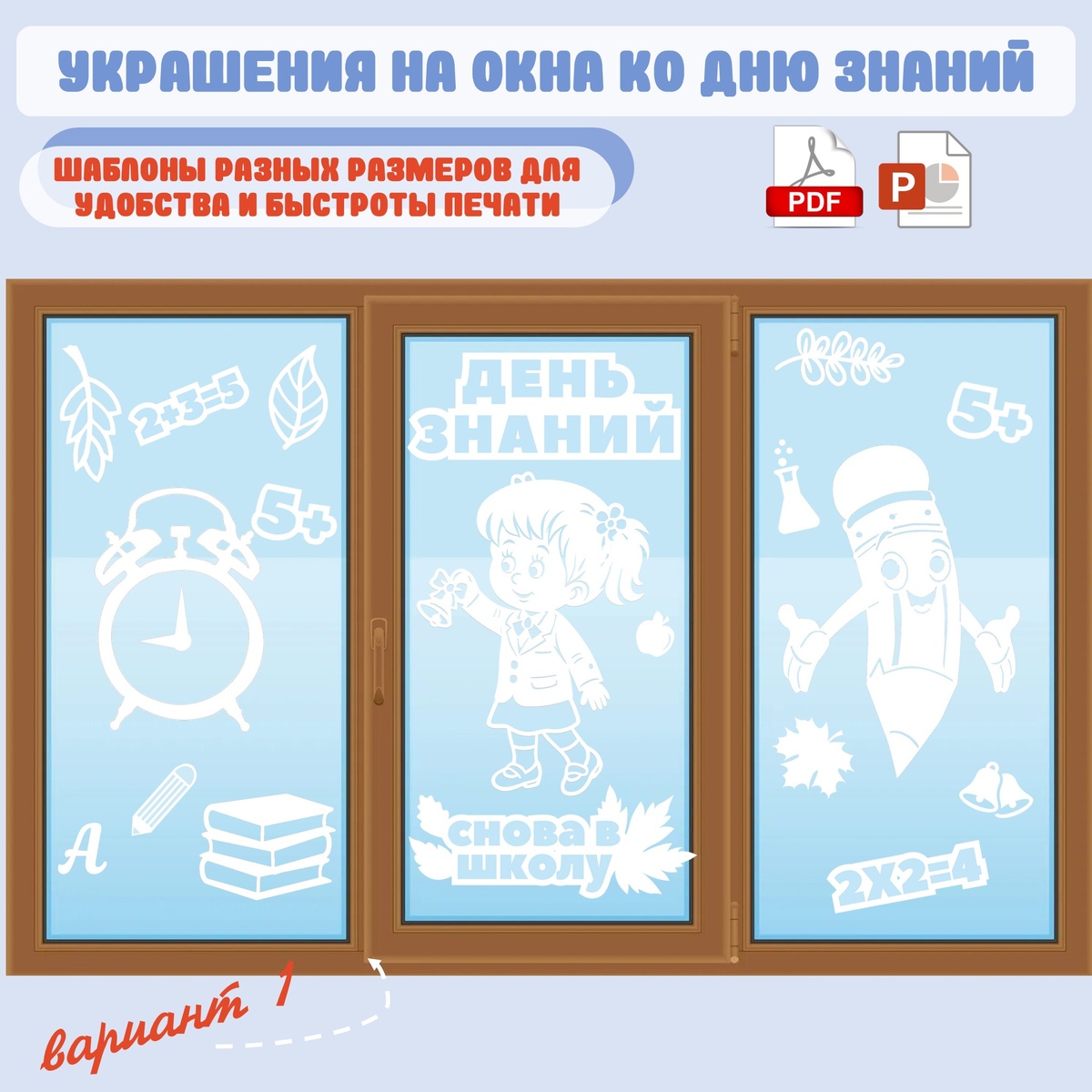 Украшение окон ко Дню знаний (1 сентября). В набор для оформления входят: девочка с колокольчиком, глобус, книги, колокольчики, листья, будильник, карандаш, шапочка выпускника, школа, яблоко, рюкзак, примеры, надписи (1 сентября, день знаний, снова в школу, с Днём знаний). Шаблоны представлены в формате А4, а также большинство элементов продублированы в формате А3 для удобства и быстроты печати. Все элементы в формате png, поэтому вы самостоятельно сможете настроить необходимы вариант печати.
