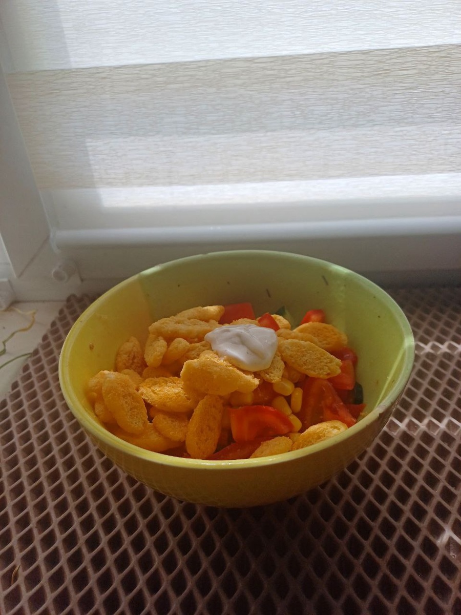 Всем привет , сегодня хочу поделиться с вами рецептом салата , который я готовлю последнее время практически каждый день. Рецепт не новый , но он мне очень нравиться: вкусно , полезно и не калорийно. Для приготовления нам понадобиться : Овощи нарезаем, выкладываем в салатницу , добавляем сверху консервированную кукурузу , сухарики и сметанный соус. Так же можно добавить вареное яйцо , маринованные грибочки сыр или капусту , а сверху украсить сезонной зеленью ( укроп , петрушка , базилик, листья салата). С таким салатом я предпочитаю пить зеленый холодный чай. Делитесь своими рецептами "летних" салатов в комментариях.
