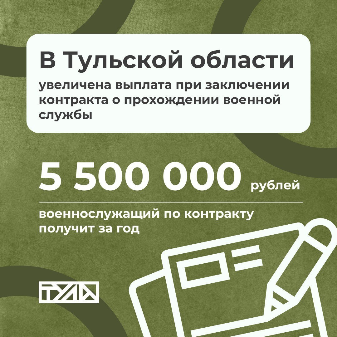 Глава региона сообщил об увеличении выплаты при заключении контракта на военную службу Если гражданин России заключит контракт в Тульской области в период со 2 июня по 31 июля, то в первый год военной службы ему будет выплачено 2,6 млн рублей из регионального бюджета и 400 000 рублей — из федерального. По итогу года военнослужащий по контракту сможет получить 5,5 млн рублей (с учетом единовременной выплаты).