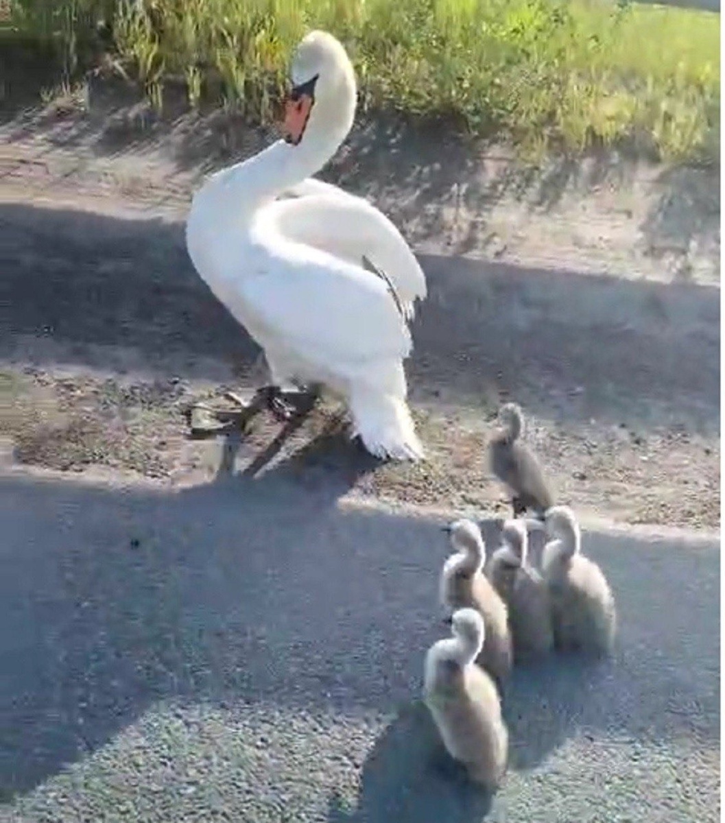 Лебедь с пятью птенцами оказалась на оживленной трассе М-7 в Кушнаренковском районе Башкирии. Лебедь и малыши пытались добраться до водоема – небольшого озера недалеко от поймы реки Кармасан. Но «пролетающие» мимо большегрузы и легковушки не позволяли этого сделать. Благо на пути семейства повстречался государственный инспектор минэкологии региона Флюр Тукташев. Хранитель природы помог лебедю и детенышам перейти проезжую часть безопасно.