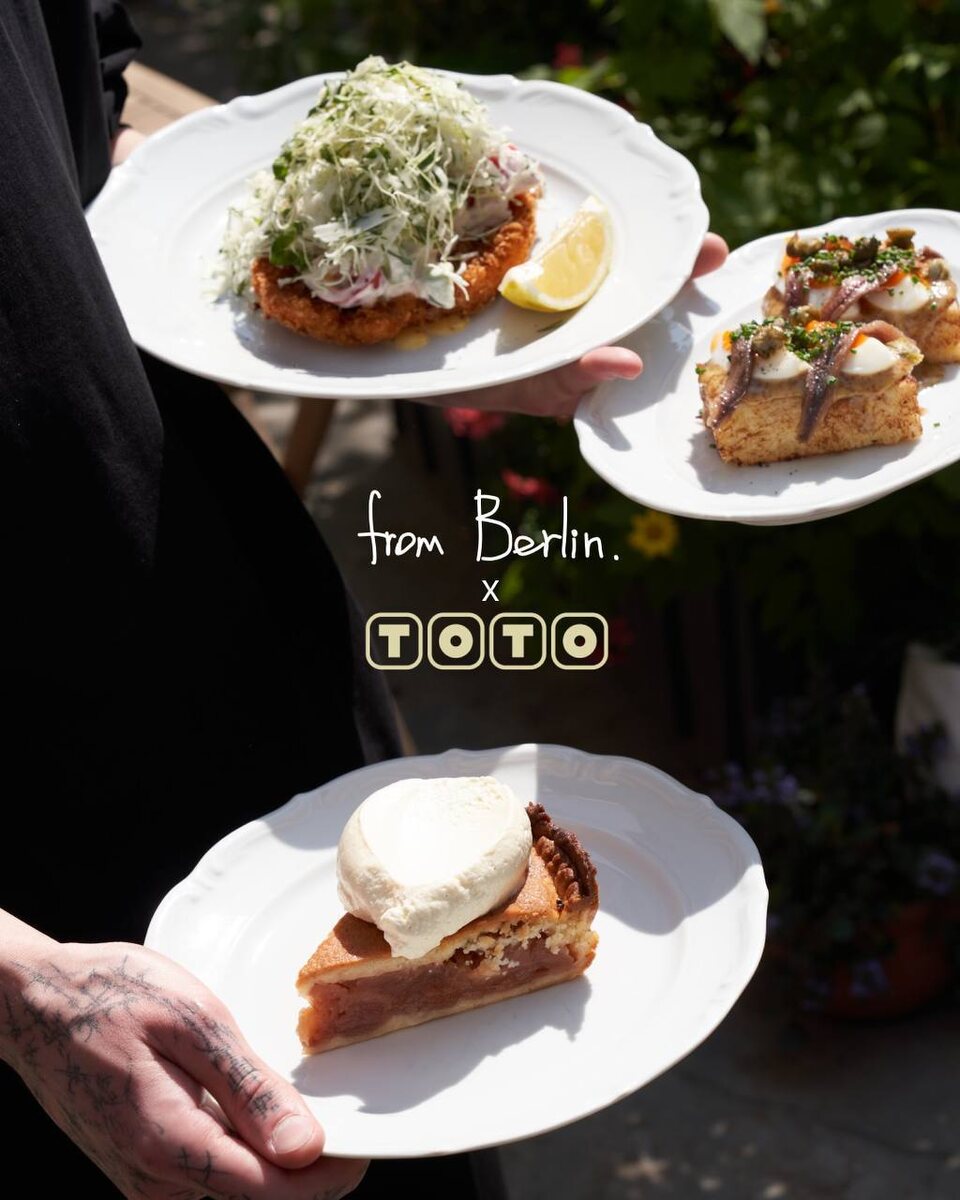 7 июня в from Berlin. можно будет попробовать любимые блюда и напитки из «Тото»: тост с анчоусами и яйцом на сливочной бриоши с медово-горчичным соусом, куриный шницель с деревенским салатом, яблочный пирог с кремом «Дипломат» и американо с юдзу.