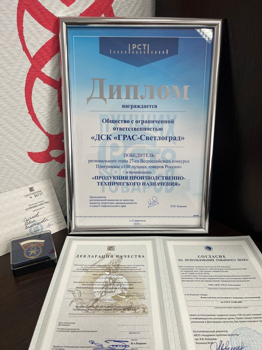 Гордость российского производства – именно так можно охарактеризовать успех ДСК «ГРАС-Светлоград» на федеральном этапе 27-го Всероссийского конкурса Программы «100 лучших товаров России». Продукция предприятия под торговой маркой «ГРАС» получила высшую награду в престижной номинации «Продукция производственно-технического назначения». Особого внимания заслуживает генеральный директор предприятия Сучков Иван Викторович, который был удостоен почетного знака «Отличник качества» – высшей награды, подтверждающей его личный вклад в развитие производства и поддержание высоких стандартов качества. Этот успех не просто очередная награда на полке предприятия. Это подтверждение того, что ДСК «ГРАС-Светлоград» остается верным своим принципам: создавать качественную продукцию, внедрять инновационные технологии и стремиться к совершенству в каждой детали. Победа в конкурсе – это результат труда всего коллектива предприятия, где важен вклад каждого профессионала, от тех, кто непосредственно создаёт п