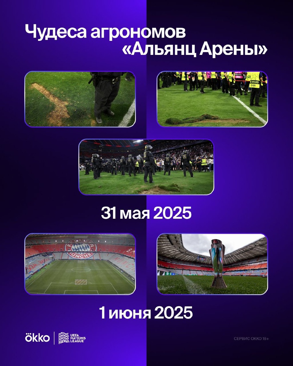 Агрономы «Альянц Арены» — настоящие волшебники 💫 31 мая фанаты «ПСЖ» уничтожили газон стадиона после победы своего клуба в ЛЧ, а на следующий день все проблемы с полем были мгновенно исправлены. Уже сегодня вечером на арене сыграют Германия и Португалия. Чудеса да и только! 😱