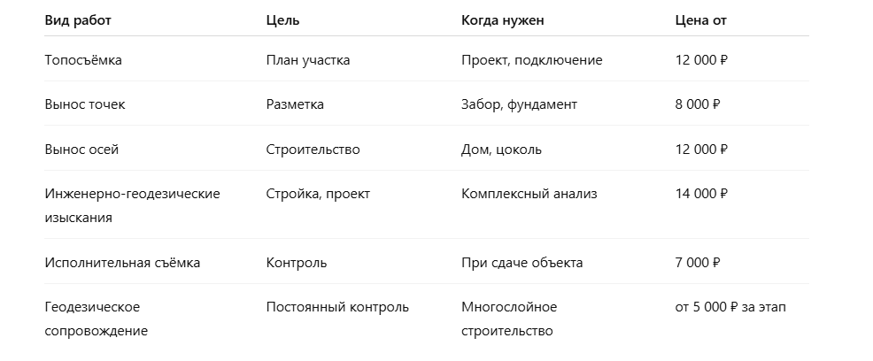 При строительстве, оформлении участка, подключении коммуникаций или разрешении споров с соседями не обойтись без геодезических работ. Но какие именно нужны вам? Что входит в понятие инженерно геодезических изысканий? В этой статье разберём, какие бывают виды геодезических работ, чем они отличаются, и как выбрать именно те, которые требуются в вашей ситуации. Геодезические работы — это комплекс измерений, вычислений и построений, которые позволяют точно зафиксировать объекты, рельеф и границы участка на местности и в проектной документации. Они обязательны на всех этапах жизненного цикла участка или объекта: от проектирования до эксплуатации. 📍 Геодезия = точность. Без неё нельзя построить, согласовать, подключить или узаконить. Используются для строительства и проектирования. Включают: 📌 Необходимы при получении ГПЗУ, проектировании домов, согласовании в архитектуре. Самый популярный вид съёмки. Позволяет: 💡 Часто используется в комплексе с геологией и выносом точек. Перенос координ