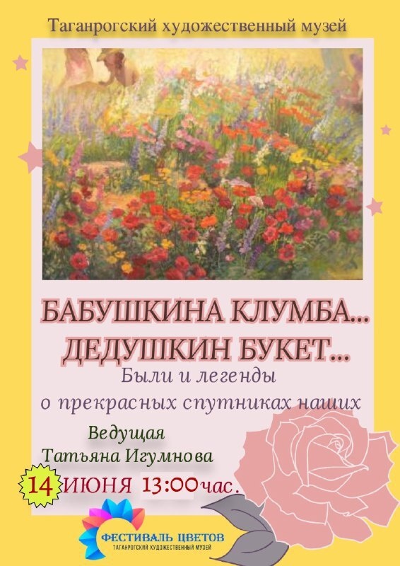 Дорогие ДРУЗЬЯ! В программе Фестиваля цветов в художественном музее есть особенно теплое мероприятие-воспоминание «Бабушкина клумба...Дедушкин букет...». Его ведущая Т.А. Игумнова отправится вместе с вами по волнам памяти и расскажет были и легенды о прекрасных спутниках наших. Встреча состоится 14 июня в 13.00 час. ул. Александровская, 56 тел. 38-31-70 #таганрогский_художественный_музей