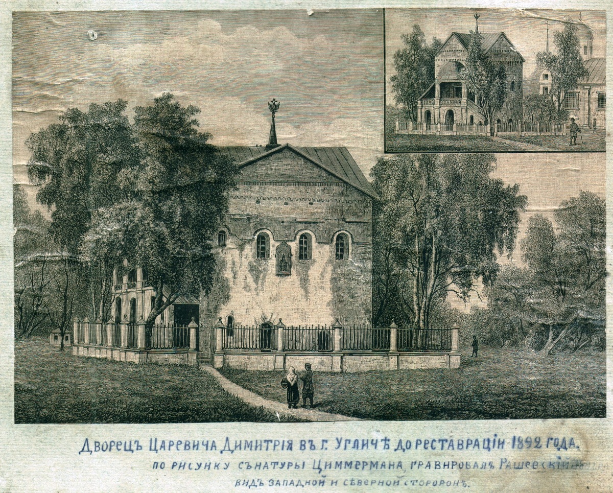 Иллюстрация "Общий вид палаты угличских удельных князей до реставрации 1892 г." вид с западной и северной стороны