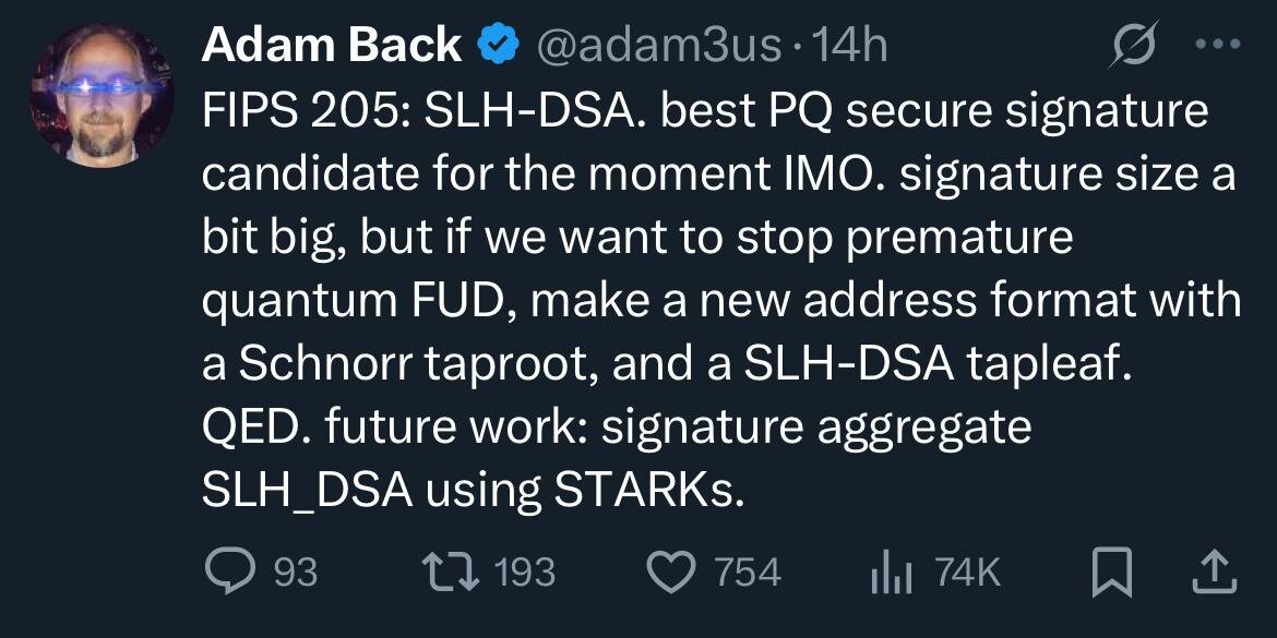 Квантовый взлом биткоина — реальный риск или страшилка? Адам Бэк предлагает конкретное решение. И оно уже лежит на столе. Если коротко, он пишет: «Хватит плодить страхи насчёт квантовых компьютеров. Хотите спокойствия? Давайте просто встроим защиту в Bitcoin». И даёт план. Разбираем по шагам. Адам предлагает использовать SLH-DSA — это алгоритм цифровой подписи, устойчивый к квантовым атакам. Да, он «тяжёлый», подписи большие. Но он уже признан стандартом (FIPS 205) и реально работает. Это не теория — это инструмент. Как его внедрить? Через Taproot. Идея в том, чтобы создать новый формат адресов, где по умолчанию вы тратите монеты обычной Schnorr-подписью (как и сейчас). Но в одной из веток вшит резервный выход — SLH-DSA-подпись. Если завтра объявят: «Квантовая машина уже взламывает ECDSA!» — вы можете потратить свои монеты альтернативным способом, защищённым от квантов. Как запасной выход из сейфа, который никто не видит, но он есть. Вишенка на торте: он предлагает в будущем уп