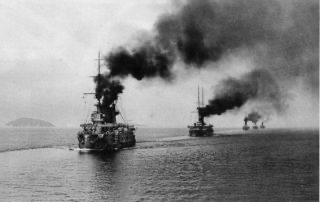 Русская эскадра встречается с японской в проливе Цусима. В пролив русские вошли 14 мая 1905 года, в годовщину коронации царя Николая II. На кораблях подняли парадные флаги, весь личный состав был в парадной форме.