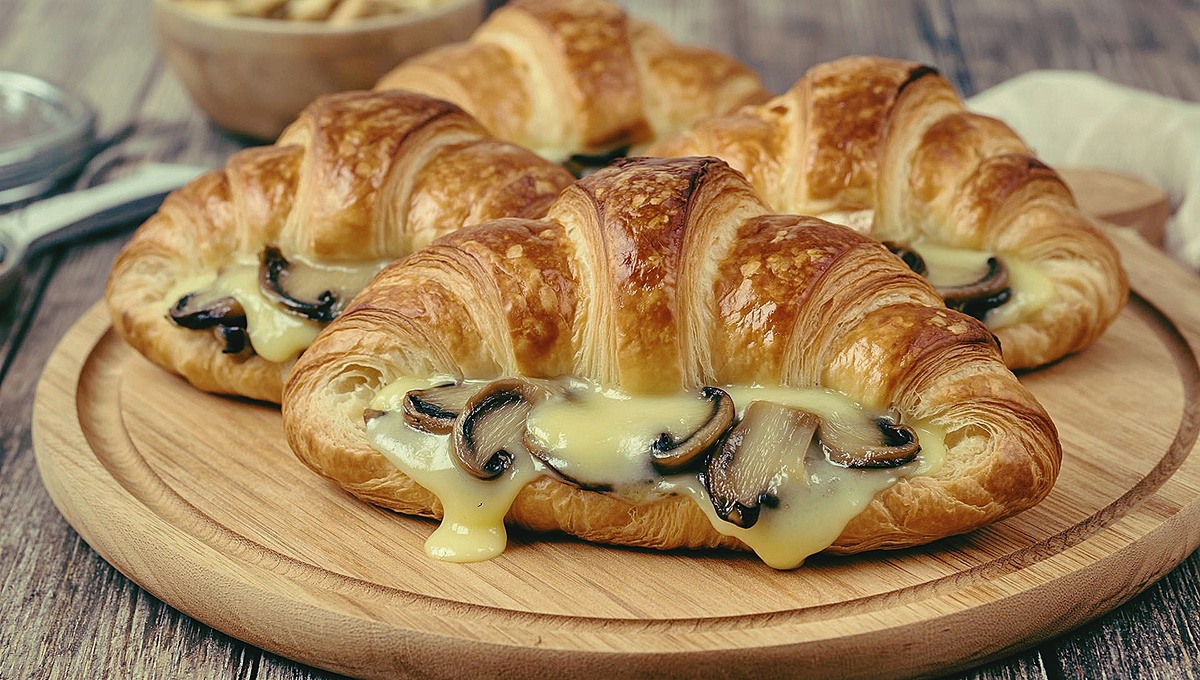Шампиньоны промыть и просушить. Нарезать пластинками примерно пол сантиметра. В сковороду влить растительное масло и добавить грибы, обжаривать минут 15 на среднем огне, посолить и поперчить по вкусу. Круассаны разрезать на две части (вдоль), подсушить на сухой сковороде. Сыр натереть на терке. Лук мелко нарезать. На каждую половинку круассана выложить грибы и посыпать сыром. Затем отправляем в хорошо разогретую до 220 градусов духовку минут на 5. При подаче посыпать зеленым луком. Так же к круассанам можно подать нарезанные помидоры черри. Приятного аппетита!