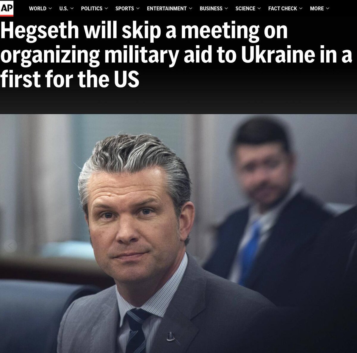 Министр обороны США Пит Хегсет впервые с 2022 года не примет участия в заседании Контактной группы по вооружению Украины — ни лично