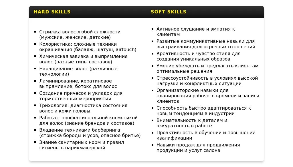 - Парикмахер-универсал: "Выполнение мужских и женских стрижек", "Окрашивание волос любой сложности", "Укладки волос на любой случай", "Консультирование клиентов".