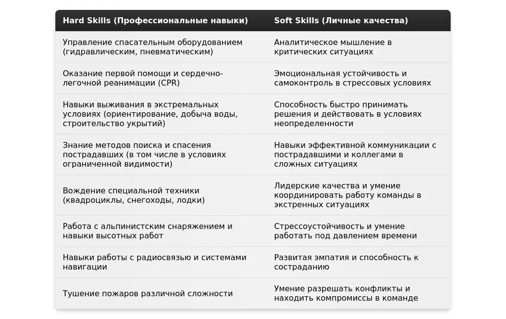 - Обязательная информация:Ключевые навыки и компетенции, релевантные профессии спасателя.