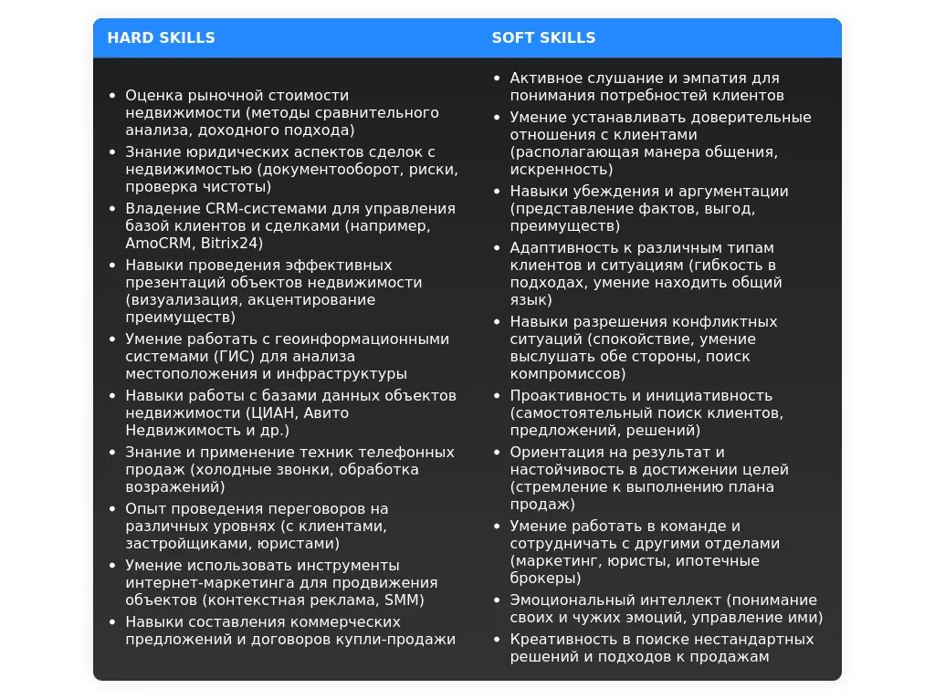 - Для вакансий на вторичном рынке: "Опыт работы с Avito и Циан", "Знание рынка вторичного жилья", "Умение проводить оценку объектов".
