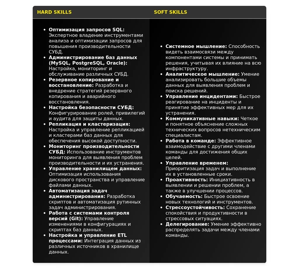 - Как описать специализацию: Укажите, с какими СУБД вы работаете, какие задачи решаете (например, миграция данных, оптимизация производительности, резервное копирование и восстановление).