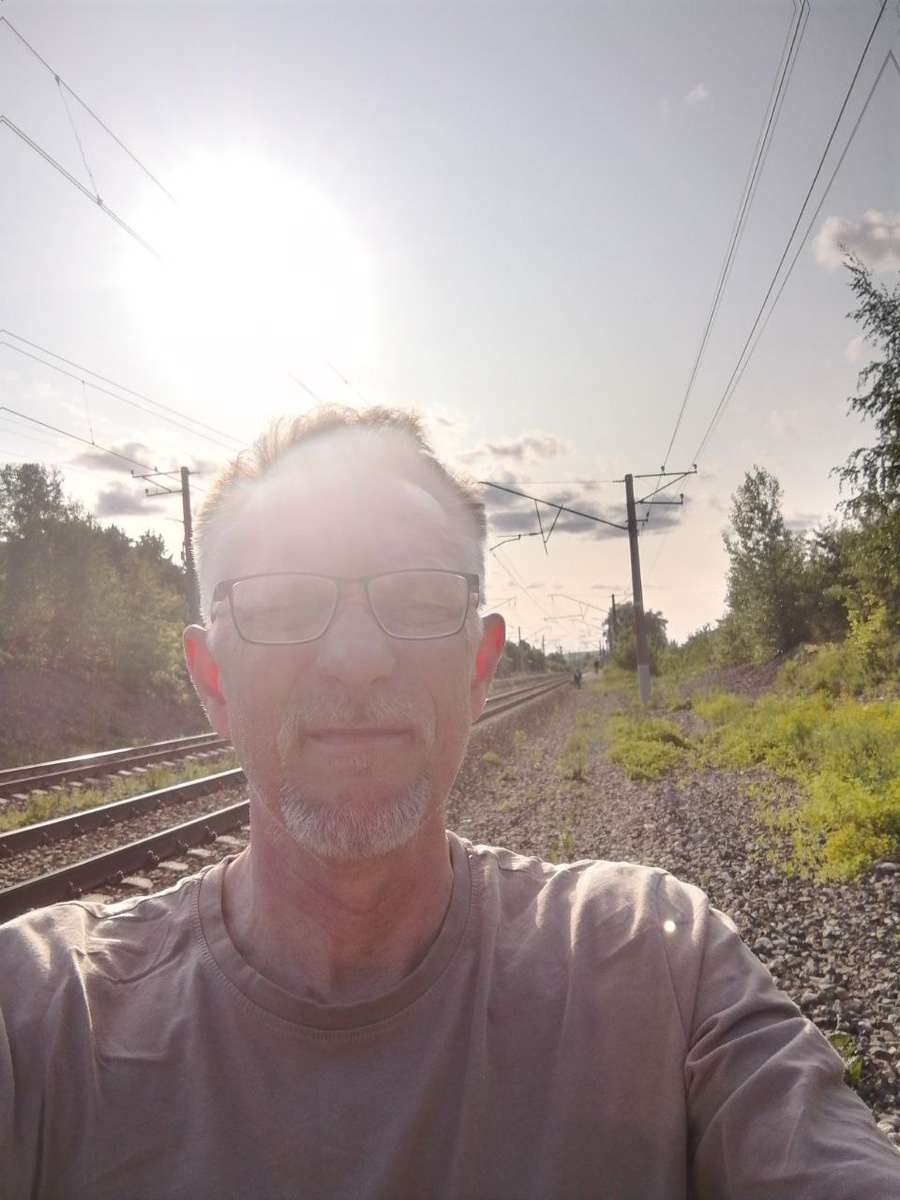 Вчера у Инженера по расписанию был подвиг: на вечерней электричке уехать на дачу, набрать бак воды и вернуться затемно. Как полон решимости этот человек! Как прекрасно он сделал свой портрет: только он - и Солнце! Ах, как давно я не смотрела на наш залив с этой высоты... И вот этот дом с башенкой тоже сто лет не видела: он по центру на переднем плане. А это фото - неожиданная радость: какой-то добрый человек устроил перила на крутой дорожке. Раньше я цеплялась за забор, но это было несерьёзно. Спасибо доброму человеку! Провожая героя в путь, я наказала привезти мне фото цветов. Живых не надо - некому в карауле с ружьём стоять и кошек от вазы отгонять. А вот посмотреть на цветочки очень хочется! Инженер добыл для меня даже невидимые. Вон как глубоко в траве этот цветок спрятался, а его всё равно разглядели! Ромашек и лилейников много. А вот что за лопух у тропинки вырос?! Кто ему разрешил, а?! Ирисы ещё стоят. Много сиреневой герани - ага, именно её. :) И даже пионы живы! Мы были вынуж