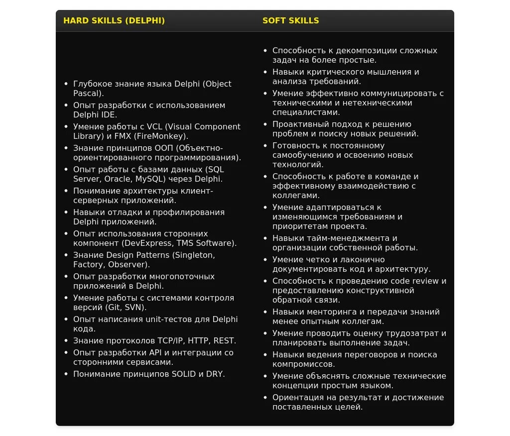 - Что обязательно включить:Ключевые навыки и технологии, которыми вы владеете (особенно связанные с Delphi).
