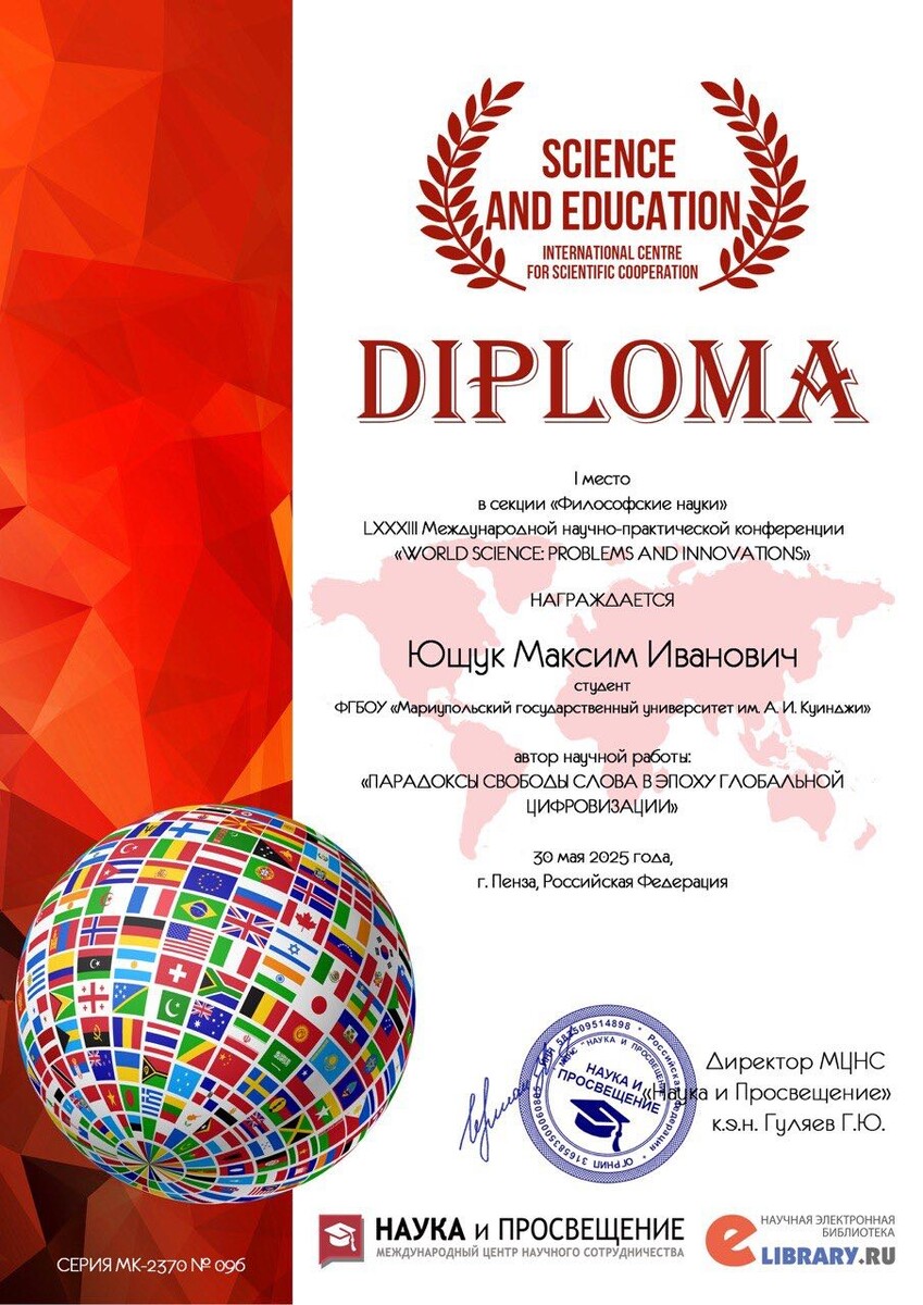 Студент факультета филологии и массовых коммуникаций МГУ имени А.И. Куинджи Максим Ющук занял I место в секции «Философские науки» на LXXXIII Международной научно-практической конференции «World science: problems and innovations». Его научная работа — «Парадоксы свободы слова в эпоху глобальной цифровизации» — прошла проверку на антиплагиат, получила одобрение редакционной коллегии МЦНС «Наука и Просвещение» и уже опубликована в официальном сборнике конференции, который размещён на сайте МЦНС «Наука и Просвещение». Кроме того, сборник будет зарегистрирован в Научной электронной библиотеке eLIBRARY.