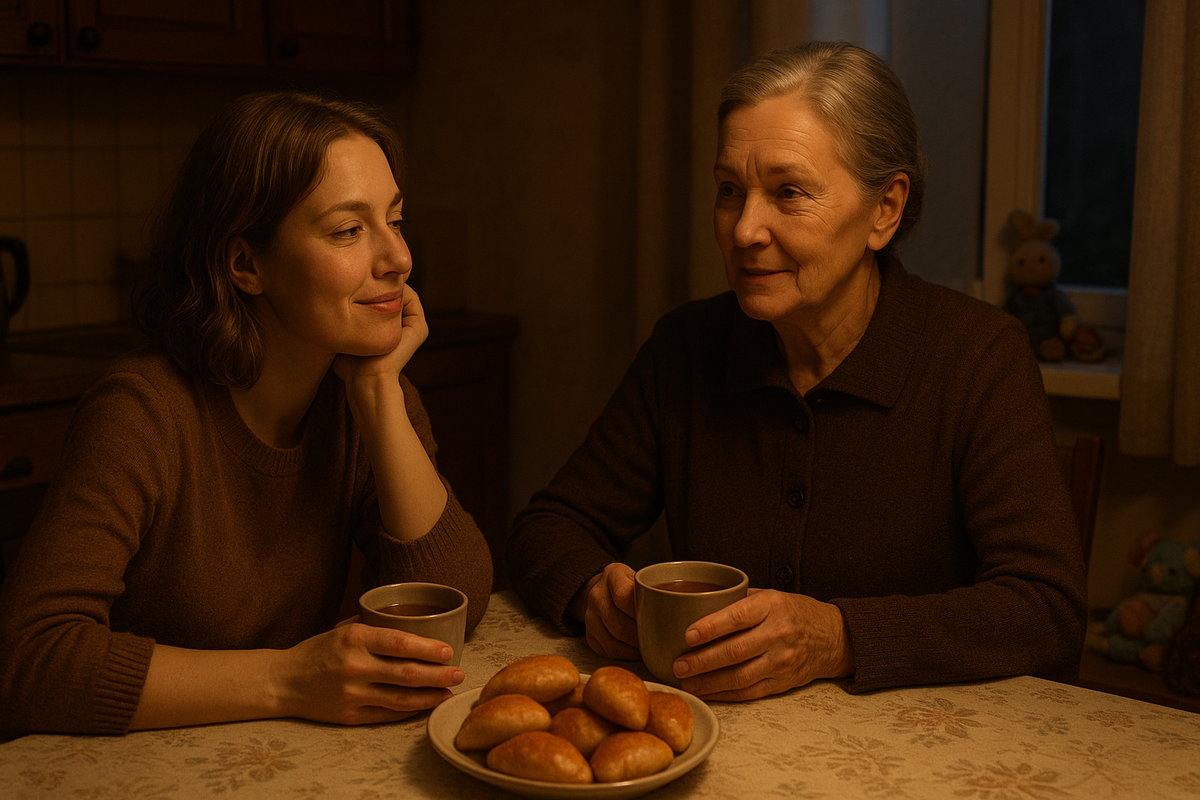 Юля впервые разрешила себе опереться на неё не только из‑за “традиции”, а потому, что вдруг почувствовала – СВОЙ человек. Не заблуждение и не спектакль про “идеальную семью”, а близость, выросшая из забот и разговоров, из супа, который не стыдно оставить на втором часу на плите, из тихих советов.