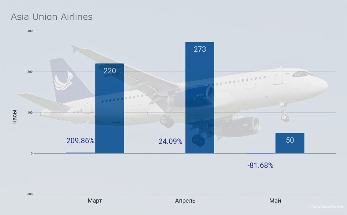 Итоги мая: Asia Union Airlines Регулярные рейсы в Медину в мае были приостановлены, и с 5 мая единственный самолет авиакомпании простаивает на земле. Среднесуточный налёт в мае снизился ⬇️ на 82.14% и составил 1.37 часа. Количество часов налёта самолёта авиакомпании Asia Union Airlines за май уменьшилось 🔽 на 81.68% по сравнению с апрелем и составило 50 часов. Общая динамика за последние 3 месяца представлена на графике. #статистика #asiaunionairlines #май2025