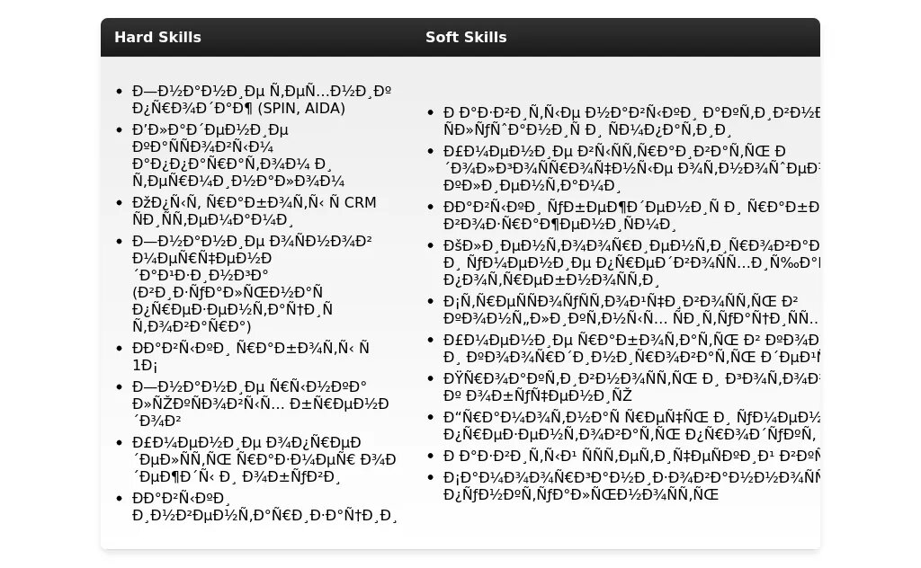 - Как выделиться: Подчеркните свои уникальные навыки и достижения, например, высокий уровень продаж, отличные отзывы клиентов, участие в тренингах и семинарах.