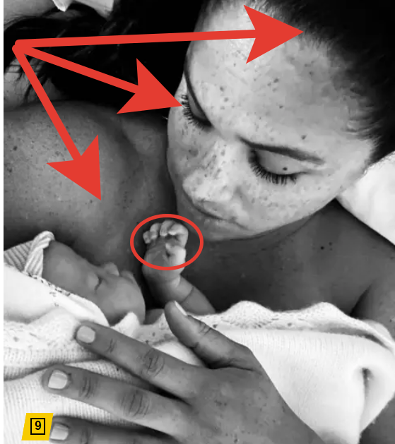 Подлинность – главная проблема Меган, она все время пытается создать идеальную картинку и выдать ее за подлинную, шоу на Нетфликс стало ярким примером этого. Певица А листа отказалась принимать участие в его съемках по этой причине. Но Меган не понимает, что сама жизнь не идеальна, а люди сразу замечают, когда их обманывают. Обманывать она продолжает, используя для этого разные поводы. Вот и фотография новорожденного ребенка для этой цели пригодилась! Но Меган абсолютно равнодушна к этому ребенку чрезвычайно прогрессивная мамаша, которая, тем не менее, боялась одно время выкладывать фотографии детей, чтобы их не сглазили, и носит амулет от сглаза на шее. Но недельного ребенка выложить не побоялась. Недельный – моя оценка возраста девочки, Меган утверждает, что фотография из родильного отделения. Она поздравила дочку с днем рождения и выложила две новых фотографии – на одной из них мама с дочкой обнимаются в лодке, вторая – эта. К первой фотографии в лодке вопросов нет – лицо ребенка за