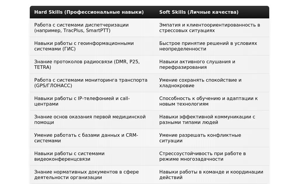 Раздел "Навыки" – это место, где вы можете продемонстрировать свои ключевые компетенции, которые соответствуют требованиям вакансии оператора диспетчерской службы.