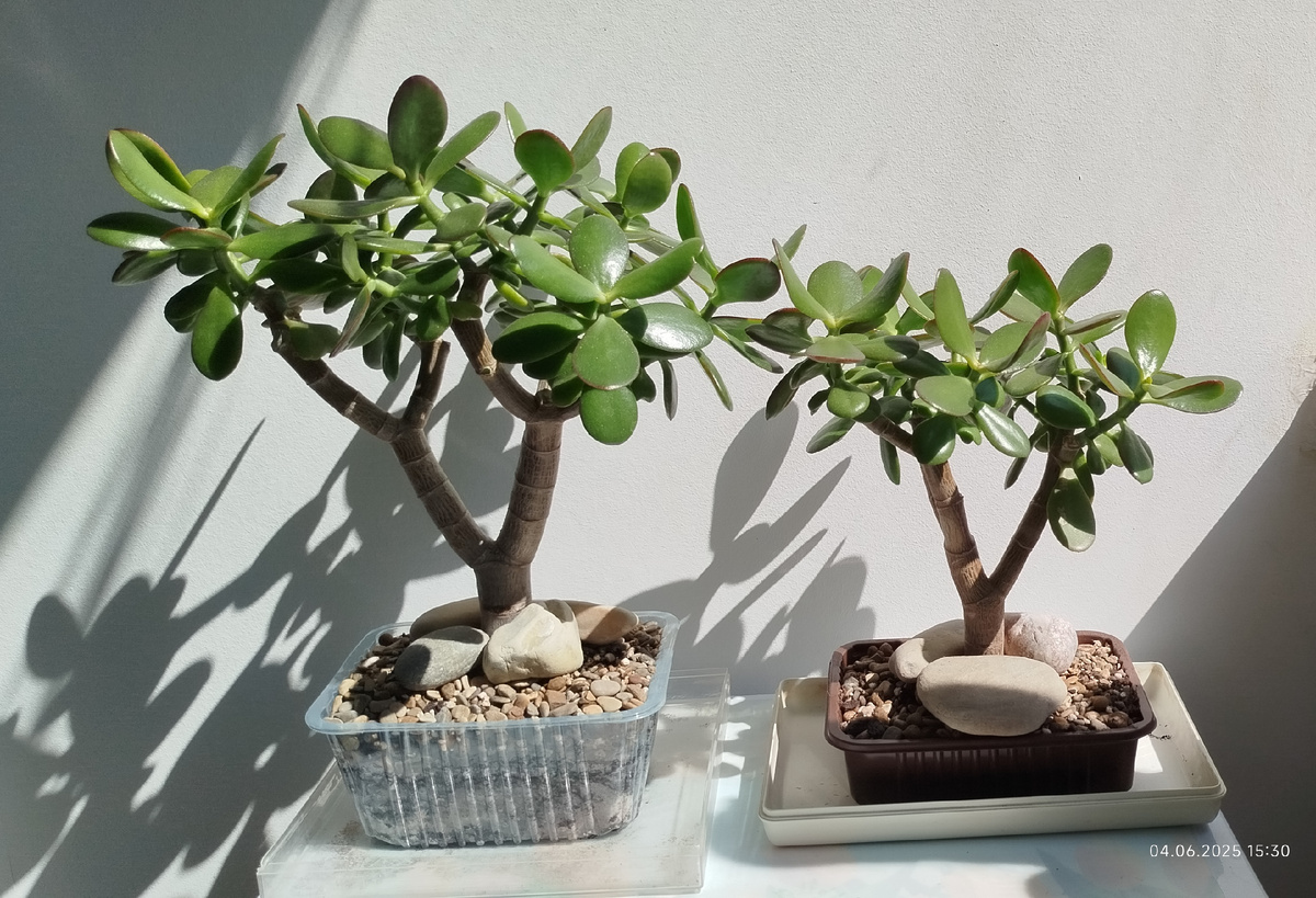 Не думала, не гадала пересаживать свои толстянки, но вчера спонтанно и неожиданно взяла и пересадила. У меня было два одноразовых небольших пластиковых контейнера, вот в них-то и пересадила. Во время пересадки чуть-чуть подрезала корни, чтобы поместились в контейнеры. Чтобы растения не вывалились из контейнеров, придавила их сверху камешками. Толстянки не стала ставить на подоконник, так как там уже слишком жарко, да и места для них маловато. Поставила рядом на тумбочку. Интересно, через какое время мои толстяночки приживутся к своим новым горшочкам? Через 1, 2 или 3 недели? 🤔 Узнаю об этом, когда увижу, что на веточках появились новые росточки. Ещё до пересадки, я прищипнула веточки. Очень хочу, чтобы стволы начали толстеть, а то что-то никак. Как-то однажды я заметила на листиках белые крапинки. Интересно, а что это за крапинки такие? 🤔 Знающие люди мне подсказали, что эти крапинки появляются от переувлажнения. Листья толстянок имеют поры, которые от переувлажнения начинают ра