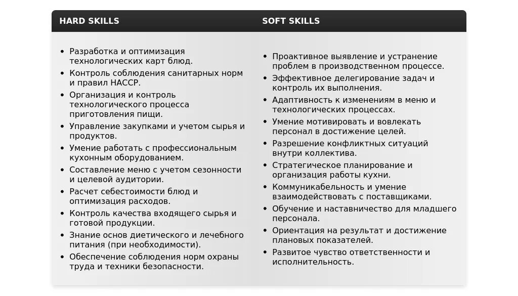 - Разделите навыки на категории (например, "Управление производством", "Знание технологий приготовления пищи", "Управление персоналом").