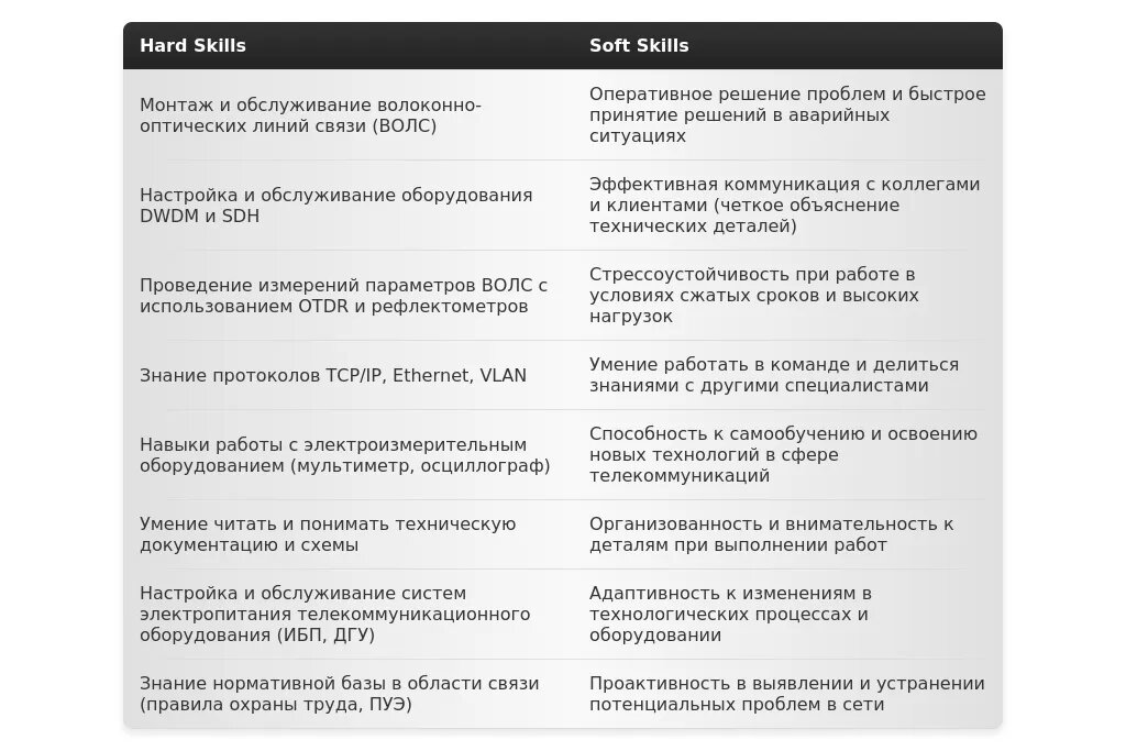 Ключевые навыки и компетенции, релевантные для позиции электромонтера связи.