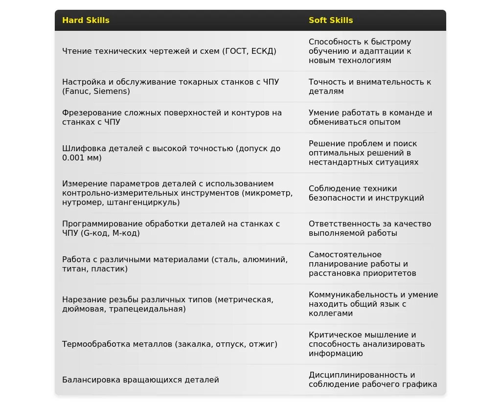 - Станочник-универсал: "Выполнение токарных, фрезерных и шлифовальных работ", "Чтение чертежей любой сложности", "Работа с различными материалами".