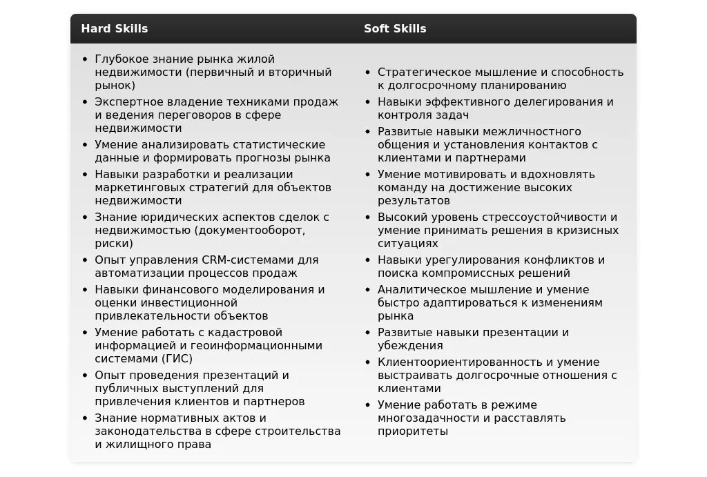 "Управление командой, ведение переговоров, навыки продаж, анализ рынка недвижимости, работа с CRM-системами, коммуникабельность, ответственность."