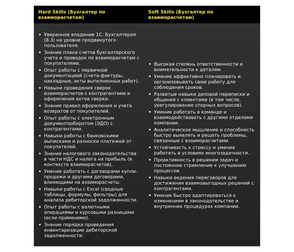 Анализ: Обязательные требования – опыт работы с взаиморасчетами, отличное знание 1С и умение проводить сверки. Знание Excel – желательное требование, которое можно усилить, указав конкретные функции и задачи, которые вы решали с помощью Excel.