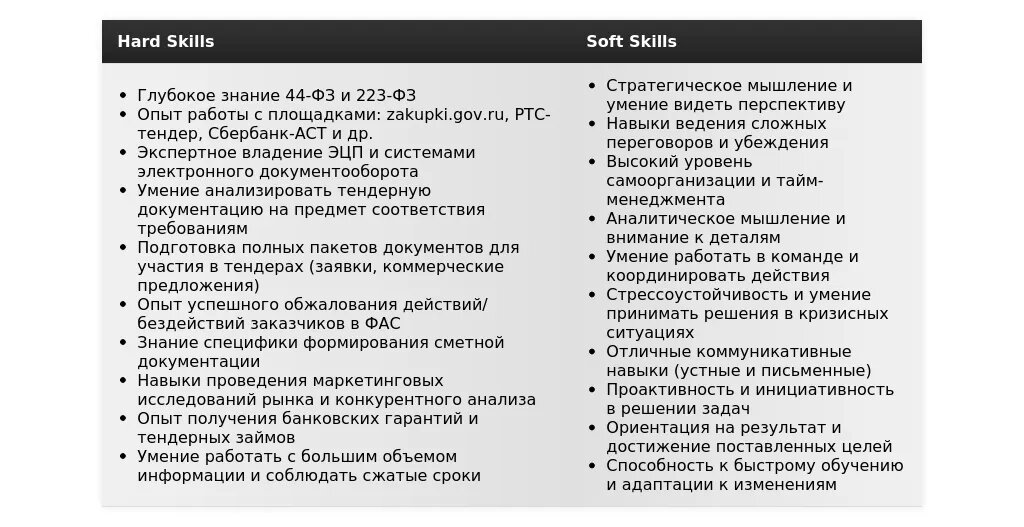 - Для вакансий с опытом работы с коммерческими тендерами: "Работа в соответствии с 223-ФЗ", "Подготовка документации для участия в коммерческих тендерах", "Анализ тендерной документации", "Ведение переговоров с заказчиками".
