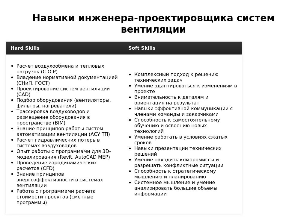 Программное обеспечение: *AutoCAD* (продвинутый уровень), VentCalc. Нормативная документация: *ГОСТ, СНиП, СанПиН*.