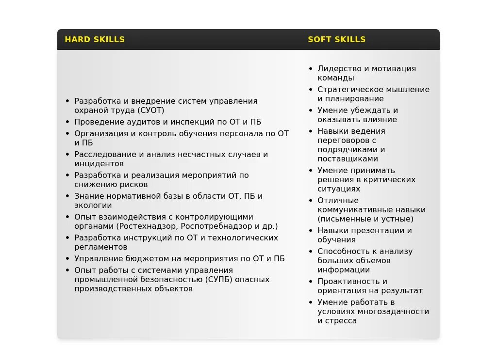- Как выделиться среди других кандидатов: Подчеркните свои уникальные навыки и достижения, которые отличают вас от других специалистов. Например, опыт внедрения новых систем управления ОТ и ПБ, успешное прохождение проверок надзорных органов, снижение уровня производственного травматизма.