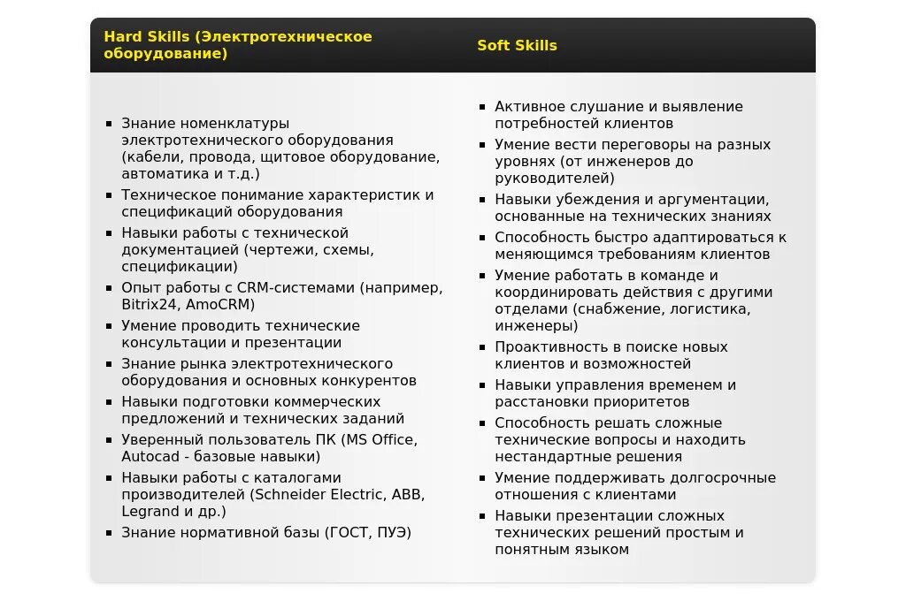"Навыки: *Продажи электротехнического оборудования, ведение переговоров с ключевыми клиентами, работа с CRM-системами (Salesforce), знание 1С, навыки презентации, техническая грамотность.*"