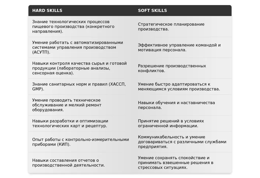 Обратите внимание на навыки, связанные с контролем качества, соблюдением санитарных норм, управлением оборудованием, знанием технологических процессов. Важны внимательность, ответственность, умение работать в команде.
