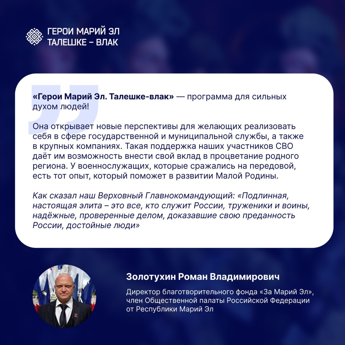 Подготовка лидеров – основа развития Марий Эл Процветание любого региона начинается с людей. Именно от качества человеческого капитала, от уровня квалификации и ответственности руководителей зависит эффективность управления, рост экономики и качество жизни населения. В Марий Эл всё больше внимания уделяется подготовке управленческих кадров, способных решать сложные задачи и задавать вектор на устойчивое развитие республики. Формирование сильного управленческого корпуса — не просто задача, а стратегическая необходимость для региона. В условиях динамичного развития и изменения внешней среды важно иметь не только опытных, но и гибких, мотивированных руководителей, готовых к инновационному мышлению и принятию ответственных решений. Кто может стать частью программы? Участниками региональной кадровой программы «Герои Марий Эл. Талешке-влак» могут стать: • ветераны и участники специальной военной операции; • имеющие высшее образование; • без судимостей; • успешно прошедшие тестировани