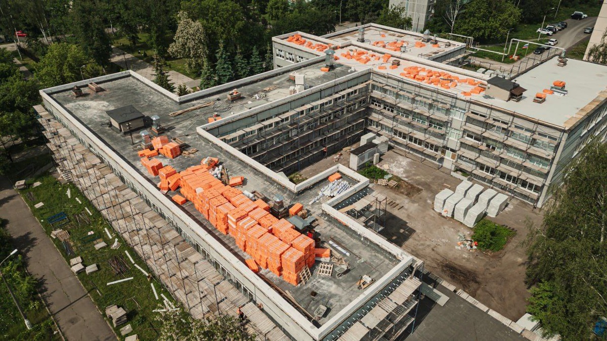 В рамках реализации Государственного контракта выполняются работы по ремонту фасада, кровли, отмостки и устройству спортивного ядра.