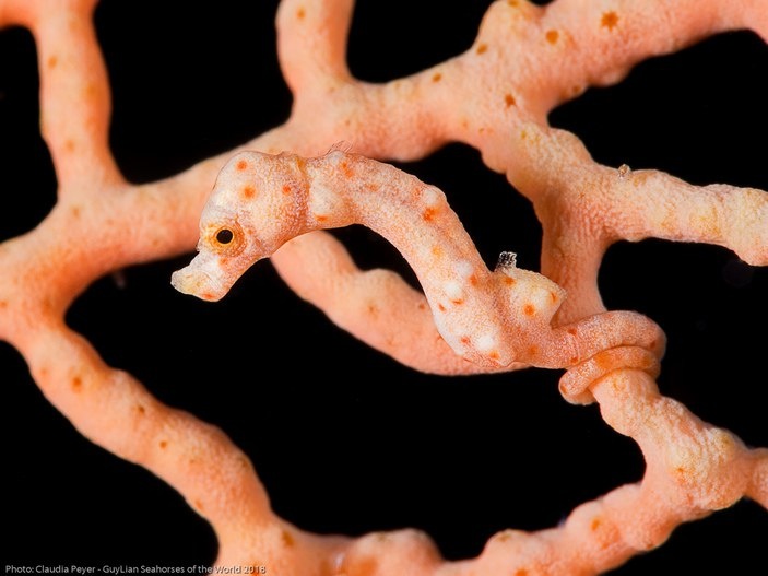 Вот у кого можно поучиться маскировке! Этот крохотный морской конек-пигмей живет на веточке рогового коралла. Он так искусно копирует цвет и фактуру коралла, что заметить его почти невозможно. Собственно, его и не замечали до 1969 года, пока его случайно не обнаружил натуралист Джордж Баргибант, когда собирал кораллы для аквариума. Этот вид коньков-пигмеев в честь ученого был назван Hippocampus bargibanti. Это был первый известный вид коньков-пигмеев. С тех пор было открыто еще семь видов. Все они длиной не больше 3 см. Все обитают в так называемом «коралловом треугольнике» - области коралловых рифов на территории Юго-Восточной Азии.