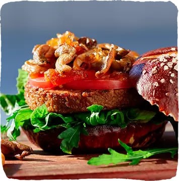 - Собираем бургер: Нижнюю часть булки смазываем соусом песто, добавляем салат, Хайбургер, помидоры и грибы с луком. Верхнюю часть булки тоже смазываем соусом песто и накрываем. 🎉