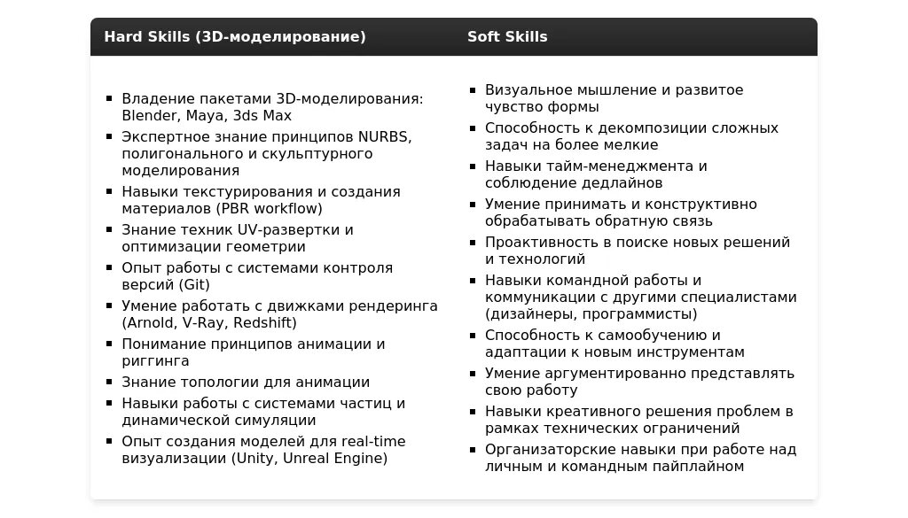- Разделите навыки на категории: Например, "Программное обеспечение", "Навыки моделирования", "Навыки текстурирования", "Soft skills".