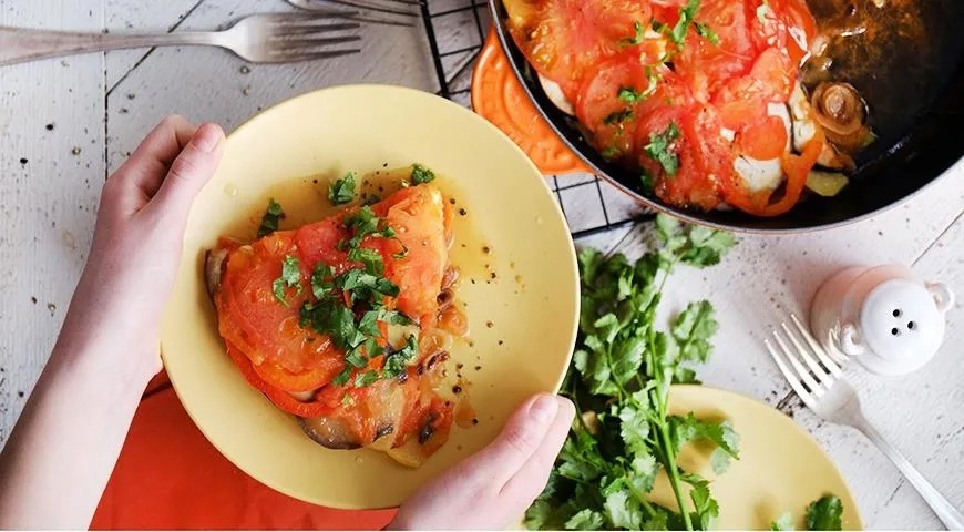 Овощи, тушенные в сковороде – совершенно легкая в приготовлении еда. Настругал кусочков, кружочков, брусочков, закинул в жаропрочную посудину, залил маслом и пусть себе с миром готовятся. Но мы простых путей не ищем: хотим не только вкусно, но красиво и необычно. Поэтому – режем все идеальными кругами, выкладываем ровными слоями, далее тушим как обычно. Лайфхаки: выбирайте очень сочные помидоры, тогда не потребуется дополнительная жидкость, вода или бульон. Морковку нарезайте очень тонко, иначе она останется жесткой. Готовность блюда проверяйте по картошке. Не ограничивайте себя в сопровождающих ингредиентах: ароматные приправы и зелень для подачи приветствуются. Подавайте тушеную красоту отдельно или в качестве гарнира. ИНГРЕДИЕНТЫ НА 4 ПОРЦИИ 5–6 помидоров 3–4 картофелины 1 баклажан 1 сладкий перец 1 морковка 2 ст. л. оливкового масла соль Все овощи, кроме морковки, нарежьте кружками толщиной примерно 0,5 см (можно полукружиями). Морковь нарежьте очень тонкими кружочками, иначе она о