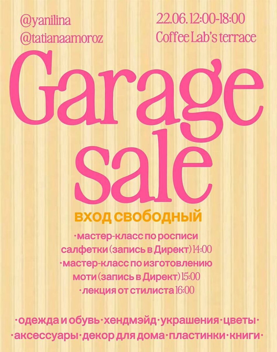 Garage sale 🛍️ 🗓️ 22 июня 12:00-18:00 📍Coffee Lab на Гончарова 54а Что можно будет приобрести: • одежду и обувь • хендмейд • украшения • аксессуары • декор для дома • пластинки • книги • цветы В развлекательной программе: ▪️14:00 | МК по росписи салфетки - тема «Цветы» 🏷️ стоимость 600₽ Необходима предварительная запись у @oyanilina ▪️15:00 | МК по приготовлению Моти - вкуснейшего десерта без сахара, собираем набор из 4 штук 🏷️ стоимость 1600₽ Необходима предварительная запись у @oyanilina ▪️16:00 | Лекция на тему «Как адаптировать тренды под свой стиль» 🏷️ вход свободный #22июня25