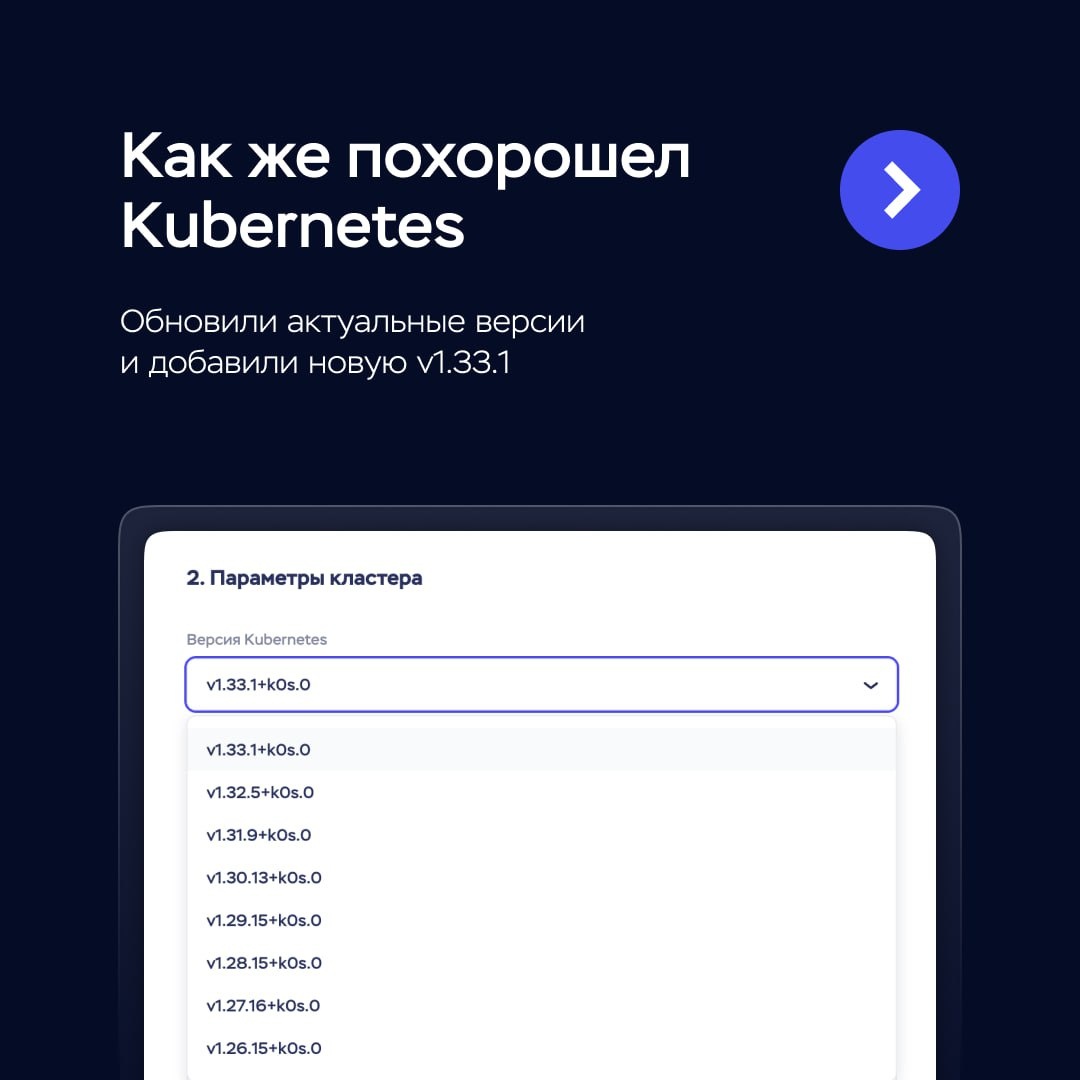 А у нас тут новости про Kubernetes вообще-то💡 В последнее время мы намного чаще делимся с вами новинками в нашем облаке и очень стараемся, чтобы вы первыми узнавали о крутых фичах. Теперь доступны обновленные версии Kubernetes: v1.30.12+k0s.0 → v1.30.13+k0s.0 v1.31.8+k0s.0 → v1.31.9+k0s.0 v1.32.4+k0s.0 → v1.32.5+k0s.0 И выкатили новую v1.33.1+k0s.0 (кстати, мы первые среди облаков в России, кто начал поддерживать эту версию) Что добавилось в v1.33.1: 1️⃣Улучшилась стабильность кластера, производительность подов и ключевых API Kubernetes 2️⃣Повысилась безопасность control plane 3️⃣Оптимизирована работа CoreDNS и kubelet 4️⃣Налажена стабильность при работе с большими CRD 5️⃣Ну и самое главное — закрыты актуальные уязвимости, ура! Апгрейднуть свой Кубик →